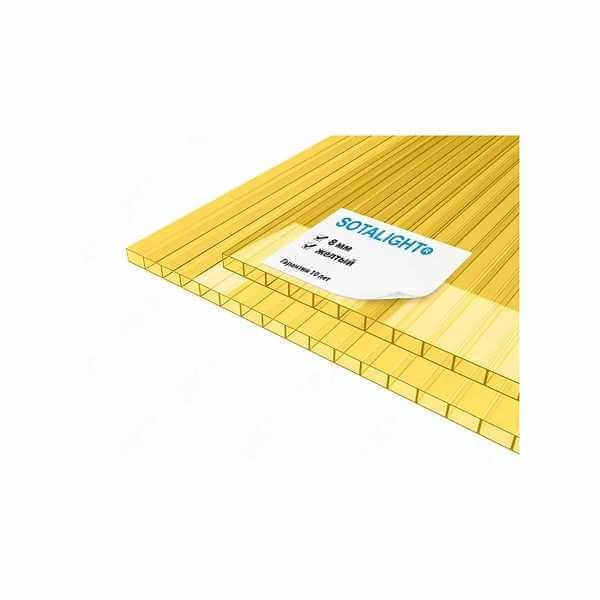 Сотовый поликарбонат 8 мм SOTALIGHT желтый 2100х6000 мм - это прочный и легкий материал, который отлично подходит для использования в различных строительных и дизайнерских проектах. Поликарбонат обладает высокой прочностью и устойчивостью к воздействию внешних факторов, что делает его идеальным выбором для создания крыш, навесов, ограждений и других конструкций.